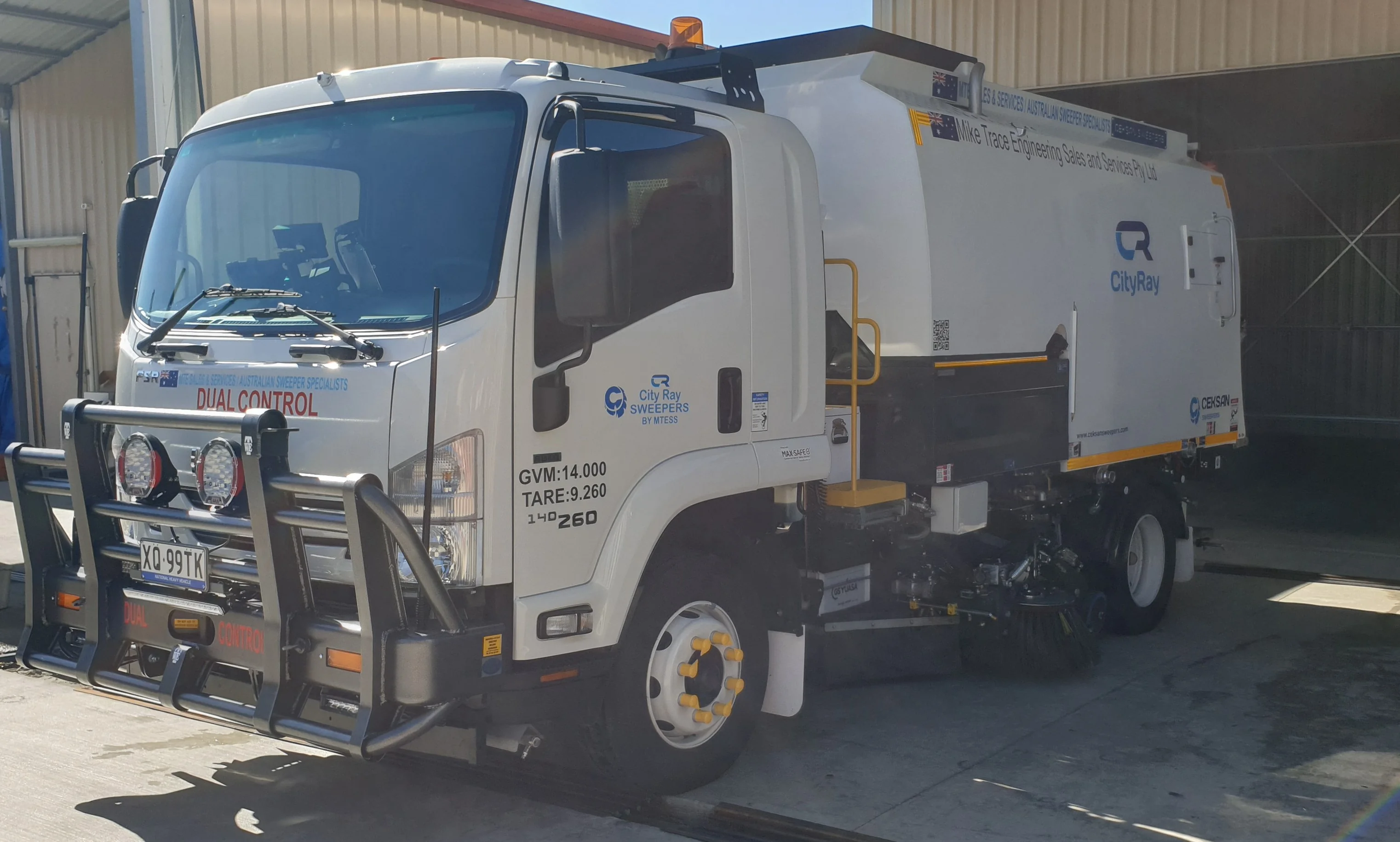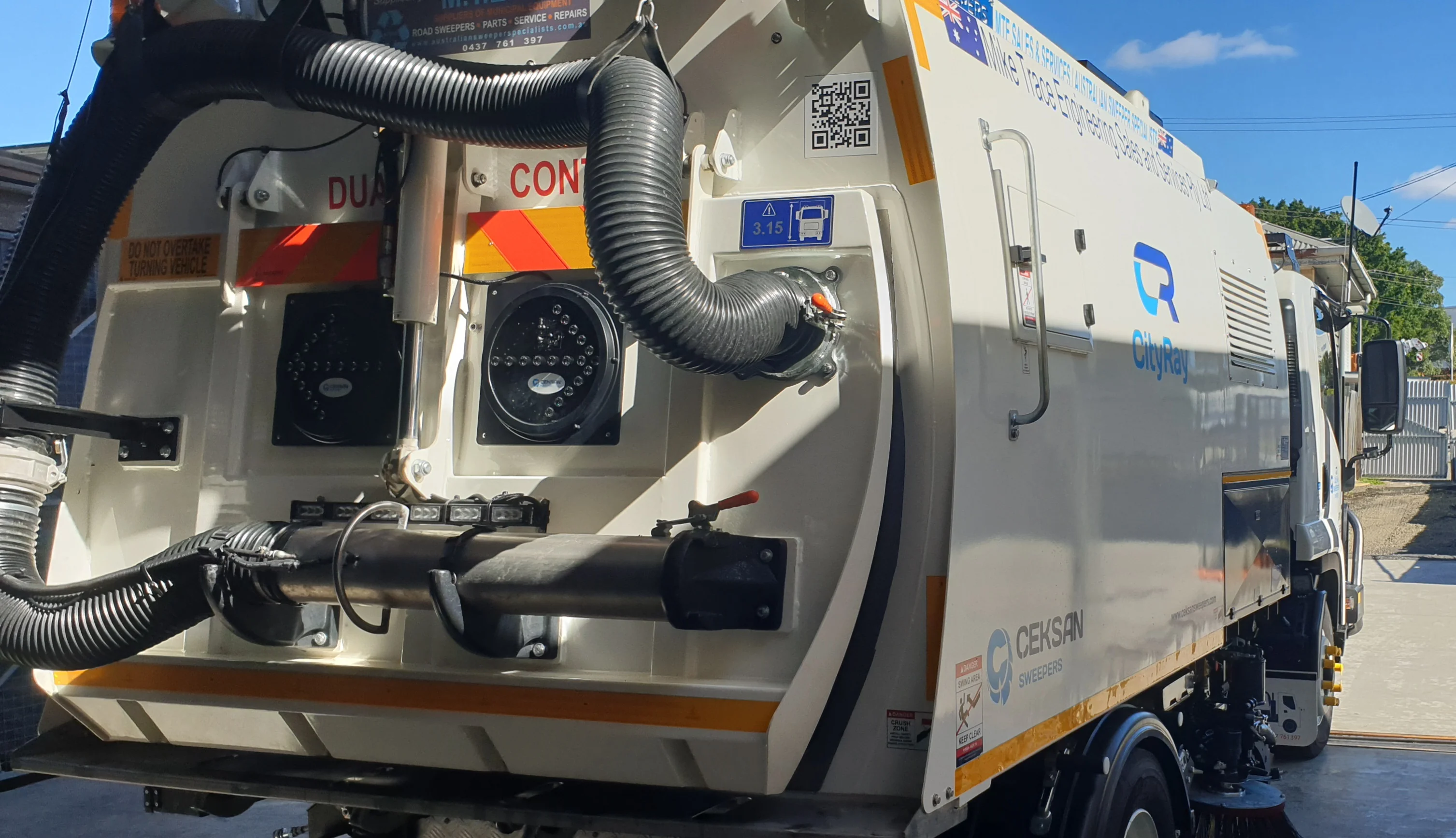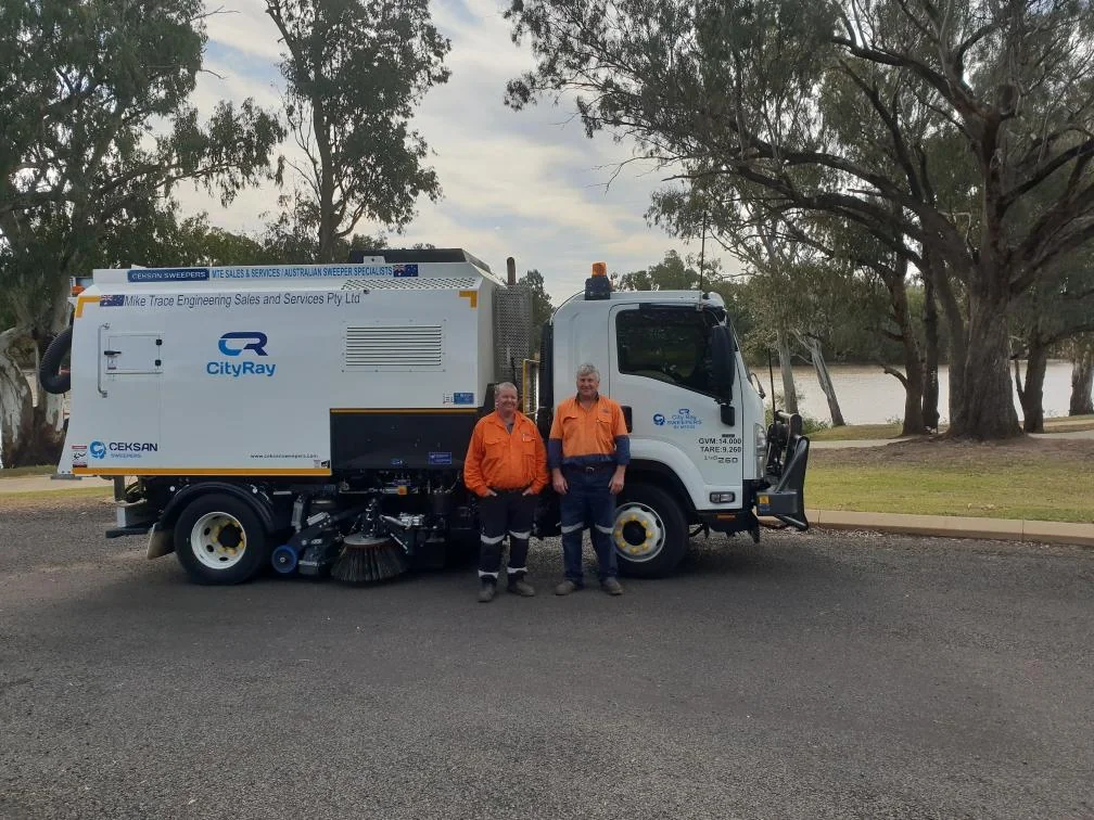 Balonne Shire Council received a customised CityRay road sweeper mounted on an Isuzu FSR with dual control, featuring extensive safety enhancements beyond standard specifications. The council prioritised safety measures including a 360-degree camera system with recording, Reverse Watch technology, speed limiter for left-side sweeping, front bulbar, LED lighting systems, window tinting, and a Groeneveld auto greasing system.